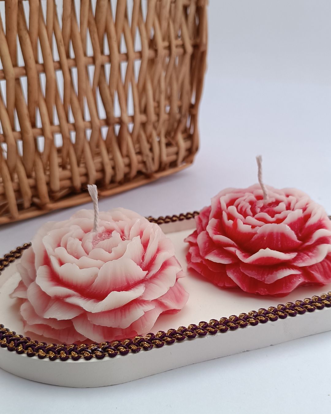 Each candle is not only a visual delight but also a sensory pleasure, infused with a gentle Rose & Peony fragrance that fills your space with a fresh, floral aroma. They are perfect for creating a serene and beautiful ambiance on a dining table, mantle, or as a charming accent piece in your living room. The detailed craftsmanship ensures that each candle is a unique work of art.